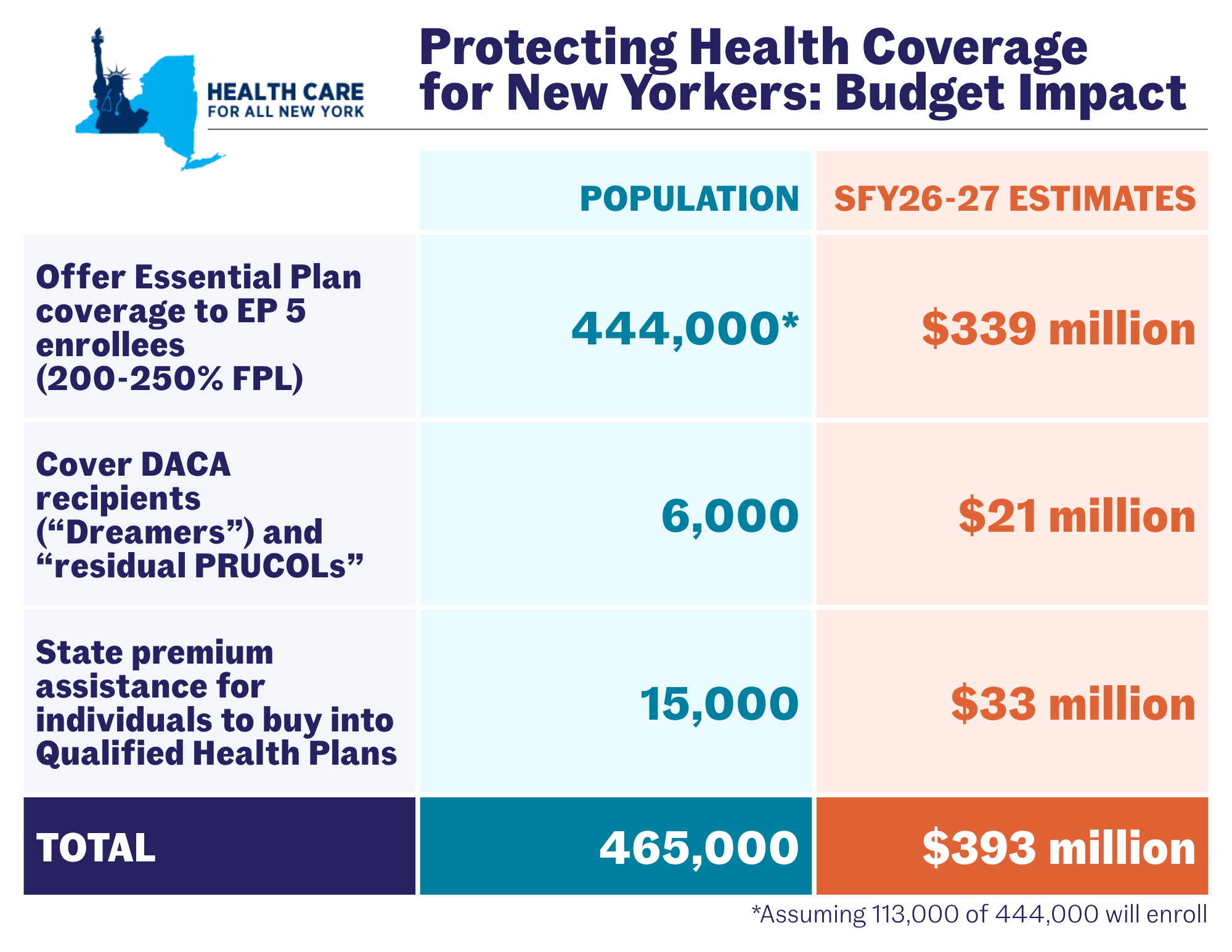 New York has an opportunity to mitigate the impact of H.R.1 on its residents. The package of proposals, outlined in S9589|A10926, will maintain coverage for half a million New Yorkers who are set to lose coverage under H.R.1 between July 1, 2026, and January 1, 2027, for less than $1 billion per year.